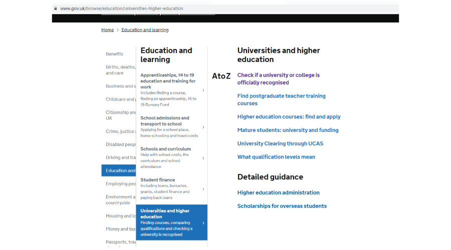 通过英国政府部门官网可以查询到院校是否受到官方认可。