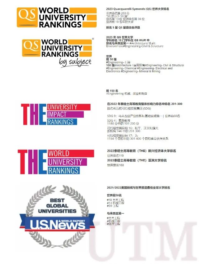 在学术交流方面,理工大学与牛津大学、剑桥大学、清华大学等多所世界著名高校建立了广泛的联系,与世界50多个学术机构进行合作和交流。除此之外,理工大学也举办了一系列学习英文的活动。举办活动的目的是为了让小学生在没有华语的情况下,使用英语与人交流,也促进彼此的友谊。作为马来西亚五大国立院校之一,马来西亚理工大学在2021QS世界大学排名中位列第187位,2022年QS世界大学排名中位列191,2024年QS世界大学排名中位列第188位 。最新一期2025年QS世界大学排名中位列第181位 。除此之外,UTM连续多年被评为QS五星级大学。